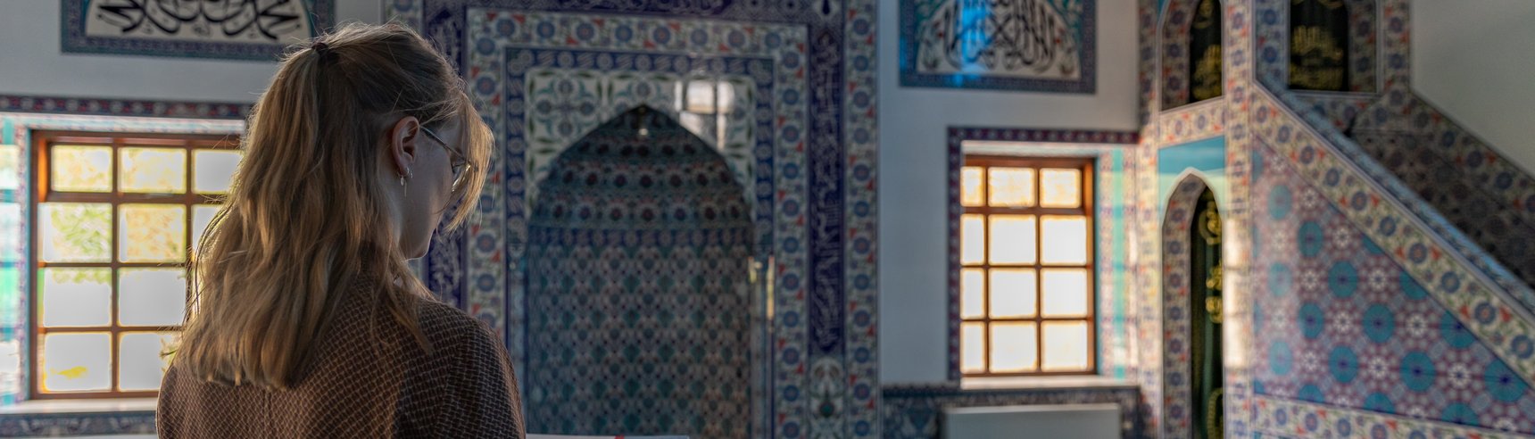 Wandelend door Almelo zie je aan de rand van het stadscentrum een witte toren boven de huizen uitsteken. Het is de minaret van de Yunus Emre Moskee. Zodra je de gebedsruimte binnenstapt, bevind je je in een betoverend schouwspel van kleur en licht. De muren zijn versierd met prachtige tegels met bloemenmotieven en eindeloze geometrische patronen. De koepel van de grote zaal is groen gekleurd en vanuit het midden hangt een enorme kroonluchter. Deze schitterende lamp en het patroon in de tegels zijn niet alleen ter decoratie, ze hebben een speciale betekenis.